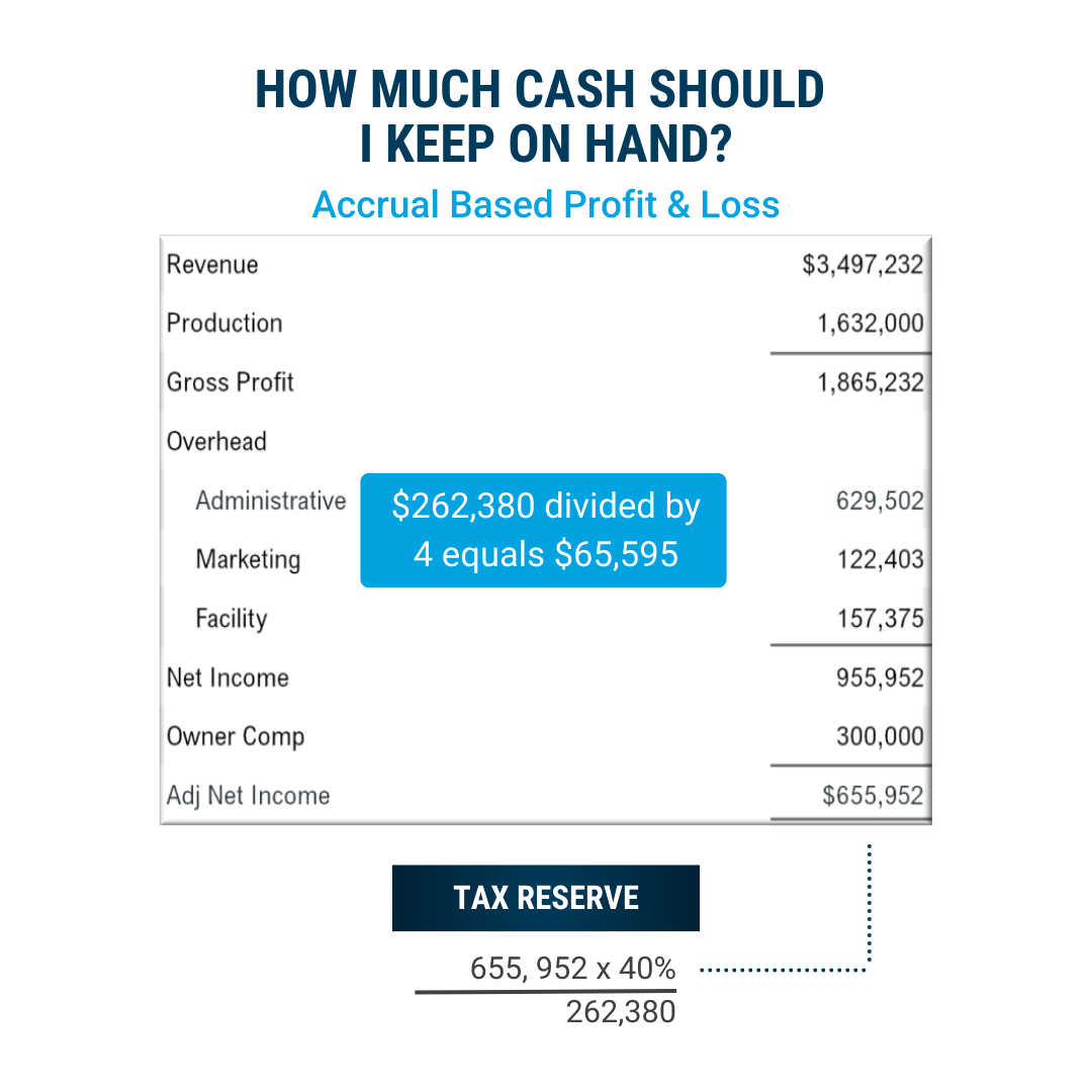 Businesses should have three separate bank account—an operating account, a cash reserve account, and a tax reserve account. If you can get your line of credit on a two-year cycle, that will be helpful in case of emergency or an opportunity that comes out of left field. Our quick math suggestion is to have the same amount in your line of credit as your cash reserve (if your bank will approve it).