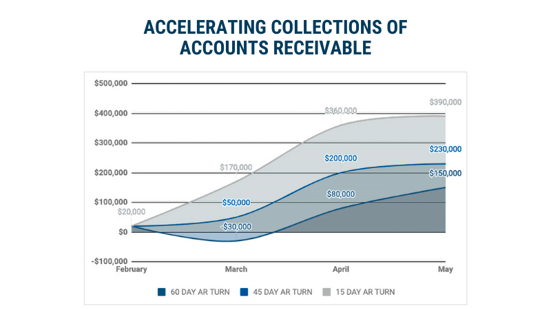 If you’re finding that you don’t have enough money to put in your cash reserve, adjusting your payment terms should be your first step. Without changing pricing or selling additional services, you can regulate business cash flow by collecting payments at a quicker pace. We’d suggest decreasing your AR (accounts receivable) days from 60 down to 15 or 30 days. By doing so, cash flow becomes more consistent, and you will no longer need to dip into your line of credit when cash is short. The below graphic gives an example of a company that ended up not needing to dip into their line of credit in March by reducing AR days to 15 days.