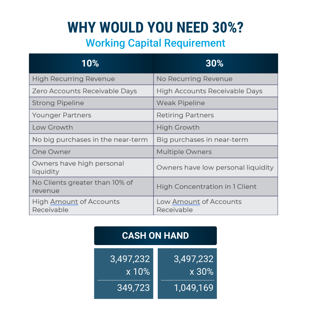The amount of cash reserves you decide to keep aside will depend on how much risk you’re comfortable with. For instance, keeping 10% equals roughly two months’ worth of expenses, while 30% covers about six months. Below is an example of a company earning $3,497,232 in revenue and the corresponding cash they should aim to have, based on their risk tolerance.